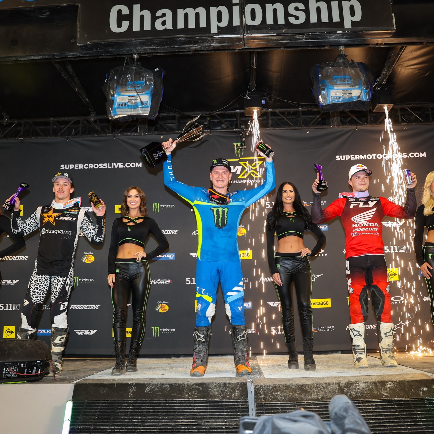 Hoor van de podiumfinishers hoe hun wedstrijd is verlopen bij de AMA Supercross in Anaheim!